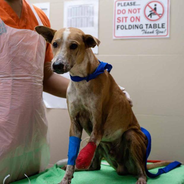 I accidentally got caught in a snare trap in the jungle. It was meant for wild animals like boar, not street dogs like me, but I accidentally stepped inside and my leg was badly damaged. I had to endure the agony of the wire cutting into my leg for a while before someone found me and contacted Soi Dog for help.